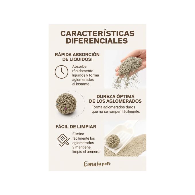 Poder Aglutinante Superior: Forma terrones firmes y compactos de manera instantánea al contacto con los líquidos, lo que facilita la limpieza diaria sin que el sustrato se desmorone.