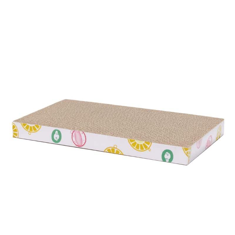 Rascador plano de cartón ecológico con diseño de frutas. Ideal para cuidar las uñas de tu gato, proteger tus muebles y decorar tu hogar con un toque alegre y moderno.