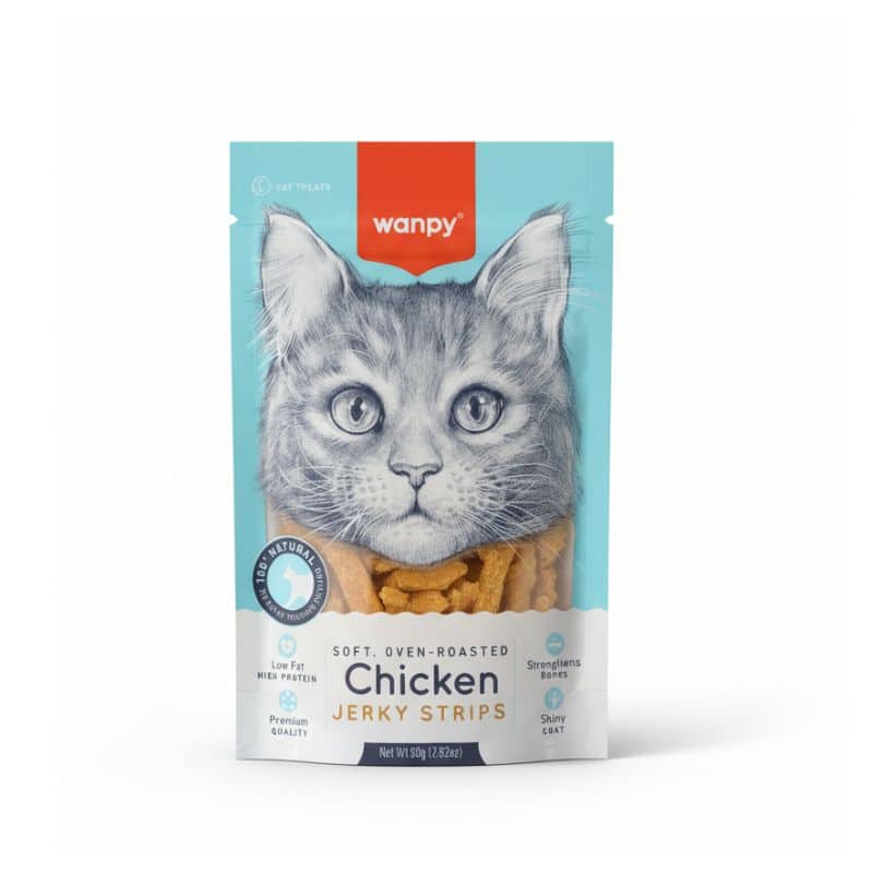 Wanpy Chicken Jerky Strips – tiras naturales de pollo horneadas. Altas en proteína, bajas en grasa y sin conservantes. Fortalece huesos y mejora el pelaje del gato.